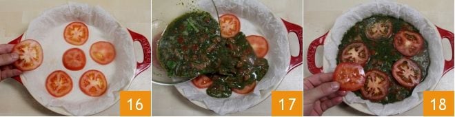 Vous pouvez maintenant commencer à composer votre omelette : prenez un moule de 26 cm de diamètre et tapissez-le de papier sulfurisé. Disposez ensuite au fond la moitié des tranches de tomate que vous aviez préparées 16. Versez le mélange d'œufs, pesto et dés de tomate dans le moule 17, en nivelant le mélange pour qu'il remplisse le moule de manière uniforme et sans trous. Terminez la composition de l'omelette en disposant les tranches de tomate restantes 18.
