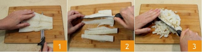 Pour préparer les beignets de morue, commencez par nettoyer cette dernière. Assurez-vous que votre morue a déjà été dessalée, sinon Comment dessaler la morue. À ce stade, retirez la peau du filet en utilisant un couteau très aiguisé et en le faisant glisser parallèlement à la chair 1. Coupez le morceau de poisson d'abord en lanières 2, puis en cubes et hachez-le au couteau 3.