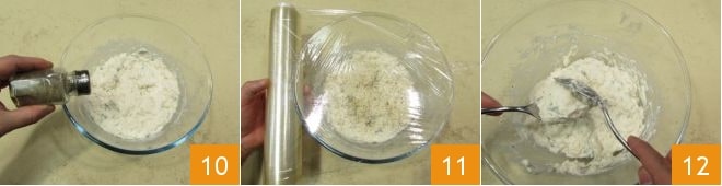 Ajoutez le poivre noir moulu 10 et si nécessaire, une pincée de sel. Couvrez avec du film plastique et laissez reposer la pâte pendant environ 20 minutes dans un endroit frais. Après ce temps, mettez à chauffer l'huile pour la friture dans une grande casserole jusqu'à atteindre une température de 175°, pour mesurer la bonne température, vous pouvez utiliser un thermomètre de cuisine. Une fois que l'huile est chaude, à l'aide de 2 cuillères que vous pouvez plonger dans l'huile de temps en temps, prélevez une portion de pâte 12