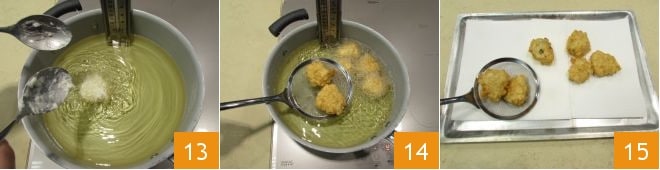 et laissez-la tomber dans l'huile bouillante 13. Faites frire ainsi quelques pièces à la fois pendant environ 6-7 minutes, en retournant souvent les beignets. Lorsqu'ils sont bien dorés 14, égouttez-les sur un plateau avec du papier absorbant pour éliminer l'excès d'huile 15. Continuez à frire jusqu'à épuisement de la pâte et servez vos beignets de morue encore chauds !