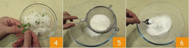 Une fois haché grossièrement, transférez-le dans un petit bol et ajoutez les feuilles de marjolaine 4. Dans un autre bol, tamisez ensemble les deux farines 5 et ajoutez la levure chimique 6.