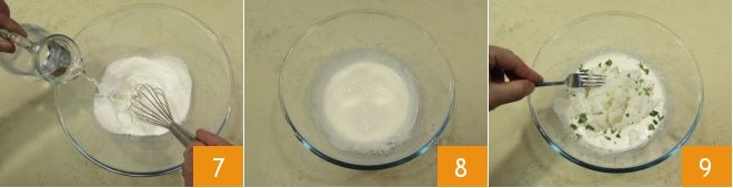 Versez l'eau glacée en filet et mélangez avec un fouet 7 jusqu'à obtenir une pâte lisse et homogène 8. Ensuite, ajoutez également la morue et mélangez le tout 9.