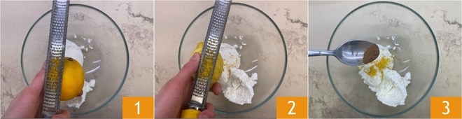 Pour préparer les beignets de ricotta sucrés, commencez par mettre la ricotta dans un bol, puis ajoutez le zeste d'orange râpé 1, celui de citron 2 et la cannelle 3.