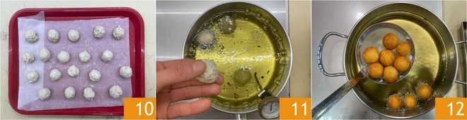 Disposez progressivement les boules sur un plateau recouvert de papier sulfurisé 10. Chauffez l'huile de tournesol jusqu'à une température de 160° et faites frire quelques beignets à la fois pour ne pas trop baisser la température de l'huile 11. Faites frire pendant 3-4 minutes, jusqu'à ce qu'ils soient dorés, puis égouttez-les avec une écumoire 12.