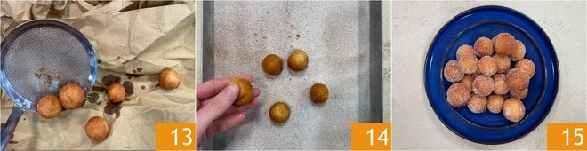 Transférez les beignets sur du papier absorbant pour éliminer l'excès d'huile 13, puis roulez-les encore chauds dans un mélange de sucre et de cannelle 14. Vos beignets de ricotta sucrés sont prêts à être dégustés 15 !