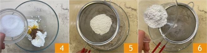 Ajoutez le sucre 4, puis tamisez la farine 5 et la fécule de pommes de terre 6 à l'intérieur.