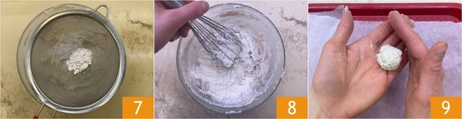 Ajoutez également la levure chimique tamisée 7 et mélangez jusqu'à obtenir un mélange homogène 8. Prélevez environ 12 g de pâte à la fois et formez des boules 9.
