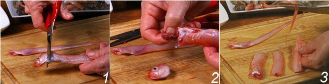 Procédez au nettoyage des poissons, en éliminant la tête 1 et les viscères 2 du poisson. Dans le cas des lançons, éliminez les nageoires dorsales et ventrales situées le long de tout le corps en les coupant avec des ciseaux, puis coupez le poisson en trois parties 3.