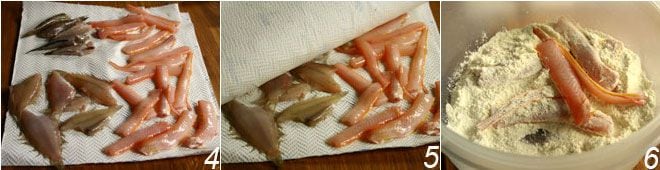 Si nécessaire, rincez rapidement les poissons sous l'eau courante 4, épongez-les très bien avec du papier absorbant pour qu'ils soient parfaitement secs 5 et passez-les dans la semoule à grain grossier 6.