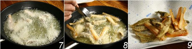 Faites frire les poissons dans une abondante huile de graines 7 (de préférence d'arachide) que vous devrez maintenir à une température constante de 175° sans jamais les dépasser. Retournez les poissons pendant la friture 8 et une fois dorés, égouttez-les et posez-les sur du papier absorbant 9 pour éliminer l'excès d'huile. Salez et servez immédiatement en accompagnant la friture d'une salade mixte ou de délicieuses frites.