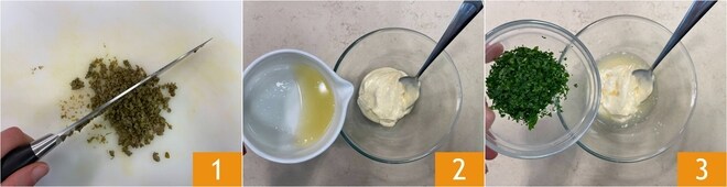 Pour préparer la friture mixte de poisson et légumes, commencez par réaliser la sauce: hachez les câpres 1, puis dans un bol versez la mayonnaise, le jus de citron et le persil haché 3.