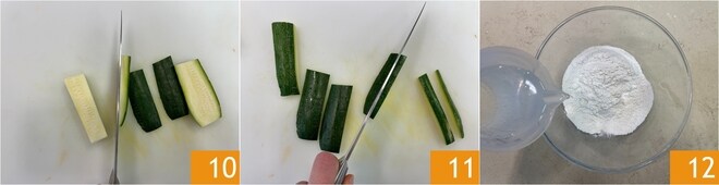 Équeutez les courgettes, coupez-les en deux dans le sens de la longueur et retirez la partie blanche à l'intérieur 10, puis découpez des bâtonnets de la même taille que les autres légumes 11. Mettez de côté et préparez la pâte pour la friture des légumes: dans un bol, versez la farine et l'eau pétillante 12.
