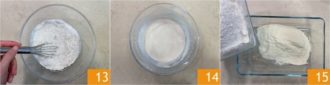 Mélangez bien avec un fouet 13 pour obtenir une pâte lisse et sans grumeaux 14. Gardez la pâte au réfrigérateur et préparez la panure pour le poisson: dans un plat, versez la farine et la semoule 15 dans les mêmes proportions (environ 150 g ou suffisamment pour paner).