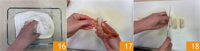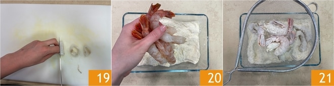 Enfin, coupez le cabillaud en morceaux, ils doivent être à peu près de la même épaisseur que les crevettes 19. Faites chauffer l'huile de friture, elle doit atteindre environ 180°C. Passez les crevettes dans la panure 20, puis éliminez l'excès de farine avec une passoire 21.