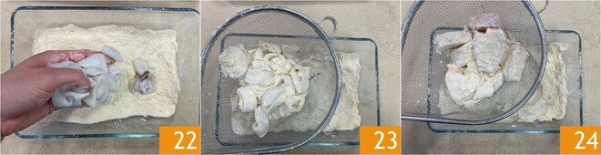Procédez de la même manière pour les calamars 22 23 et pour les morceaux de cabillaud 24.