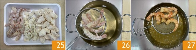 Une fois que tout le poisson est bien enrobé de farine 25, vous pouvez frire en immergeant quelques morceaux à la fois à l'aide d'une écumoire: commencez par les crevettes 26, puis égouttez-les une fois dorées 27.