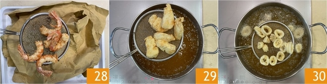 Laissez-les égoutter sur un plateau recouvert de papier absorbant pour friture 28. Continuez à frire le cabillaud 29 puis les calamars 30.