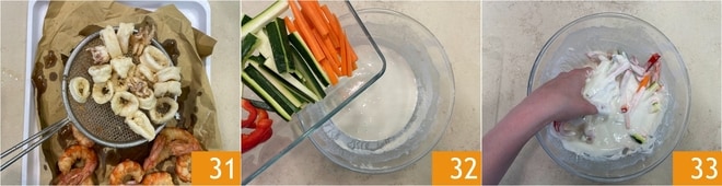Égouttez le tout sur le plateau 31 et mettez de côté. Passez aux légumes: trempez-les dans la pâte préparée peu avant 32 et mélangez bien 33.