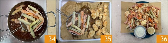 Plongez également les légumes dans l'huile chaude 34 et faites frire jusqu'à ce que la pâte soit croustillante et dorée, puis égouttez sur le papier absorbant pour friture 35. Enfin, salez à volonté. La friture mixte de poisson et légumes est prête à être servie accompagnée de la sauce aux câpres 36!