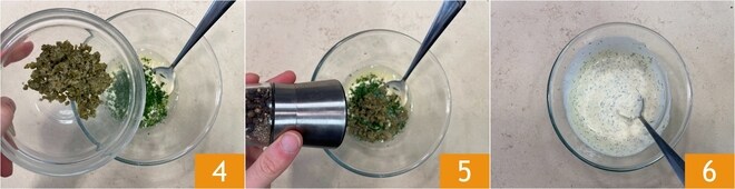 Ajoutez également les câpres hachées 4 et assaisonnez avec du sel et du poivre 5. Mélangez bien et mettez la sauce au réfrigérateur 6.