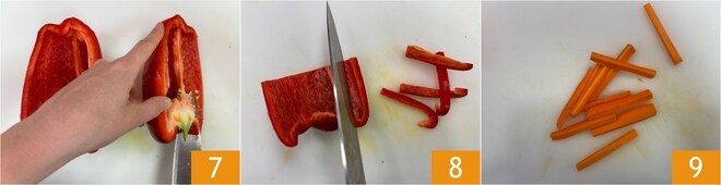 Lavez tous les légumes. Coupez le poivron en deux, retirez la tige et les graines à l'intérieur 7, puis coupez-le en bâtonnets 8. Épluchez et coupez les carottes, puis coupez-les également en bâtonnets 9.