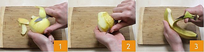 Pour préparer les fruits frits caramélisés, lavez et épluchez les pommes, les poires et les bananes (1-2-3) ;