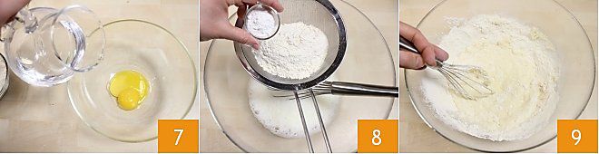 Séparez les jaunes des blancs d'œufs et mettez ces derniers de côté. Battez les jaunes avec l'eau 7 et ajoutez également la farine et la levure tamisées 8. Battez bien avec un fouet pour éviter la formation de grumeaux 9.
