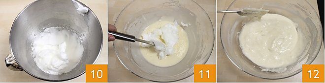 Montez les blancs en neige ferme avec une pincée de sel 10 et incorporez-les délicatement à la pâte, en mélangeant de bas en haut, pour ne pas les casser (11-12).