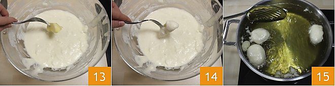 Faites chauffer l'huile de graines dans une grande casserole et, lorsqu'elle est prête, trempez chaque morceau de fruit dans la pâte, en l'enrobant complètement (13-14), et plongez-le dans l'huile bouillante 15.