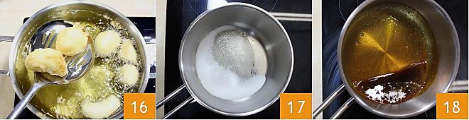 Lorsque la pâte est bien dorée, égouttez les fruits frits de l'huile 16 et laissez-les sécher sur un plateau avec du papier absorbant. Une fois les fruits frits, préparez le caramel (Caramel pour plus d'informations) : dans une petite casserole en acier à fond double, ajoutez le sucre en poudre une cuillère à la fois 17 et faites-le fondre lentement à feu doux, sans mélanger mais en tournant délicatement la casserole. Vous devez obtenir un caramel brun 18 (la température doit osciller entre 166°-175°, aidez-vous d'un thermomètre à aliments).