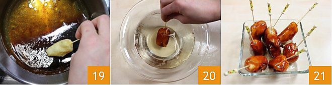 Lorsque le caramel est prêt, piquez chaque morceau de fruit frit avec un cure-dent et trempez-le rapidement dans le caramel 19. Égouttez l'excès de caramel et plongez le morceau de fruit dans l'eau glacée, que vous aurez préparée dans un bol, pour faire durcir le caramel 20. Disposez les fruits frits caramélisés sur un plat de service et servez 21.