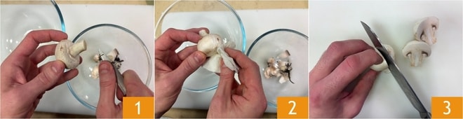 Pour préparer les champignons à l'huile, commencez par nettoyer les champignons de Paris : détachez la base du pied 1 et avec un torchon ou une serviette humide, nettoyez légèrement la surface 2 (si les champignons sont très sales, vous pouvez opter pour un bref rinçage à l'eau froide pendant quelques secondes). Divisez-les en deux 3.