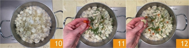 Quand la solution reprend l'ébullition 10, ajoutez le romarin, le piment 11 et l'ail haché 12.