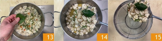 Ajoutez également les feuilles de laurier 13 et mélangez. Attendez 1 minute, puis laissez tiédir et égouttez les champignons avec une écumoire 14, en les transférant dans une passoire 15.