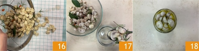 Séchez le tout sur un torchon propre 16, en les tamponnant bien. Ensuite, prenez un bocal en verre de 500 ml parfaitement propre avec un couvercle neuf. Remplissez-le avec les champignons, en les pressant légèrement 17. Puis remplissez jusqu'à la surface avec de l'huile d'olive extra-vierge en deux étapes, en attendant que l'huile se distribue dans tout le bocal 18.