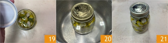 Refermez avec le couvercle 19 et immergez dans une casserole avec de l'eau froide. Allumez le feu et portez à ébullition pendant environ 60 minutes. Une fois ce temps écoulé, laissez refroidir les bocaux dans l'eau elle-même. Pour être sûr que l'opération de "mise sous vide" a bien réussi, il suffit de vérifier que le couvercle ne fait pas clic en surface en appuyant avec les doigts.