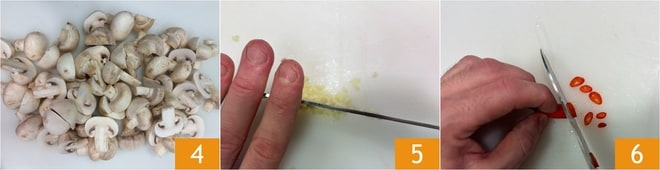 Mettez les champignons de côté 4. Épluchez et hachez finement l'ail 5, coupez le piment frais en rondelles 6.