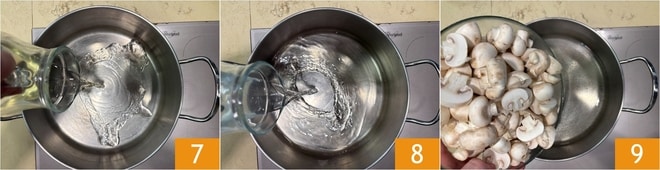 Dans une casserole, faites chauffer le vinaigre 7 et l'eau 8; dès que ça frôle l'ébullition, immergez les champignons 9 et salez.