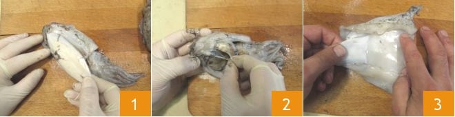 Pour préparer les fusilli moules et seiches, commencez par la Comment nettoyer les seiches. Incisez le ventre de la seiche et retirez l'os 1. Après l'avoir ouverte en deux délicatement, retirez, si présente, la poche contenant l'encre 2. Séparez la tête du corps en tirant légèrement les deux parties dans le sens opposé. Après avoir incisé le corps, retirez la peau 3.