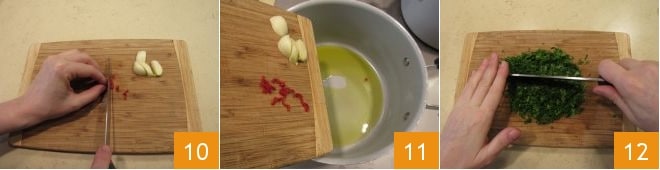 Puis prenez le piment, ouvrez-le dans le sens de la longueur et retirez-en les graines, puis coupez-le en fines lanières 7. Versez-le avec une gousse d'ail coupée en morceaux dans une poêle avec un filet d'huile 8. Faites rissoler jusqu'à ce que l'ail prenne une coloration dorée. Hachez finement le persil 9. Réservez-en un peu pour assaisonner et décorer le plat.