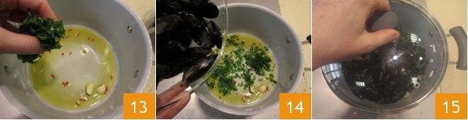 Ajoutez le reste du persil dans la poêle 10 avec les moules 11. Laissez cuire quelques minutes avec le couvercle à feu vif 12.