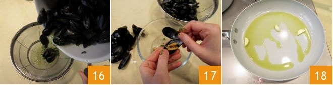 Quand les moules s'ouvrent, éteignez le feu et égouttez en utilisant une passoire à mailles fines posée sur un bol pour filtrer l'eau libérée pendant la cuisson 13. Réservez le liquide et décortiquez les moules 14, en laissant quelques-unes entières pour la décoration du plat. Prenez à ce stade une poêle antiadhésive à fond large et faites rissoler une gousse d'ail 15. Si vous préférez, vous pouvez l'écraser.