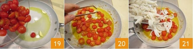Ajoutez les tomates cerises lavées et coupées en deux 16. Laissez cuire dans la poêle pendant 10 minutes à feu modéré. Ensuite, retirez l'ail 17 et ajoutez les seiches 18. Laissez cuire encore 5 minutes.