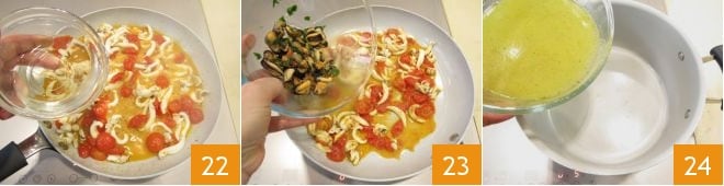 Puis déglacez avec du vin blanc 19 et ajoutez les moules 20. Faites sauter encore 1-2 minutes, puis éteignez le feu. Versez dans une grande casserole un peu du liquide de cuisson des moules 21 et réchauffez-la si nécessaire jusqu'à ébullition.
