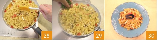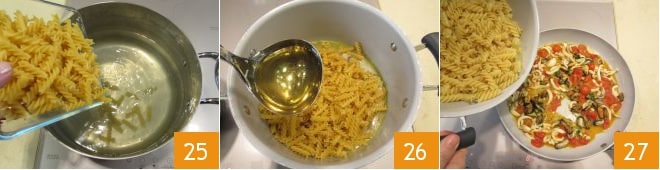 Ensuite, versez les fusilli 22 : ceux-ci doivent être couverts à niveau par l'eau de cuisson des moules, que vous pouvez ajouter au fur et à mesure 23 : si le liquide de cuisson des moules n'est pas suffisant, utilisez de l'eau bouillante ou du bouillon végétal léger. Remuez continuellement pour éviter que les pâtes ne collent. Deux minutes avant la fin de la cuisson, transférez les fusilli dans la poêle avec le condiment de moules et seiches 24.