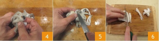 Ensuite, prenez la tête de la seiche et retirez-en le bec (la dent) 4 : vous pouvez exercer une légère pression avec les doigts sous le bec pour l'identifier et le pousser vers le haut. Incisez autour de la bulle les yeux de la seiche et retirez-les 5. Rincez les seiches sous l'eau courante. Découpez maintenant le corps de la seiche en bandes dans le sens de la longueur 6 et coupez les tentacules en petits morceaux. Réservez.