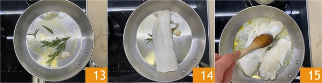 Ajoutez une gousse d'ail et une branche de romarin 13. Laissez infuser à feu doux pendant quelques minutes, puis déposez ici la morue déjà nettoyée, sans peau ni arêtes 14. Faites cuire la morue pendant environ 15 minutes, en remuant de temps en temps et en vous aidant d'une cuillère en bois pour la défaire délicatement 15.