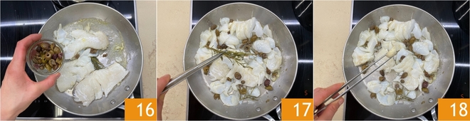 Après ce temps, ajoutez les câpres et les olives grossièrement coupées 16 et mélangez bien. Retirez le romarin 17 et la gousse d'ail 18, puis poursuivez la cuisson encore quelques minutes.