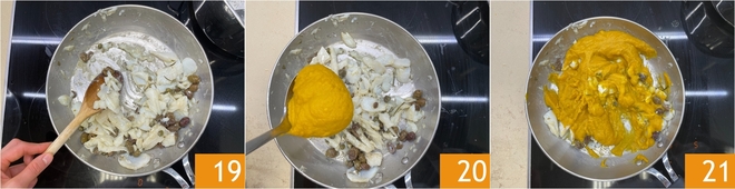 Pendant ce temps, portez à ébullition une casserole d'eau salée. Lorsque la morue est cuite 19, versez dans la poêle la crème de potiron préparée auparavant 20 et mélangez pour amalgamer le condiment 21.