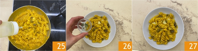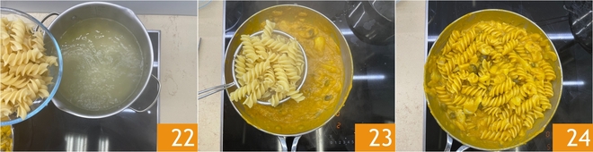 Faites cuire les pâtes 22 et égouttez-les al dente directement dans la poêle avec le condiment 23, puis mélangez bien pour les imprégner de saveur 24.